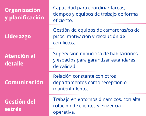 - Liderazgo: Gestión de equipos de camareras/os de pisos, motivación y resolución de conflictos.